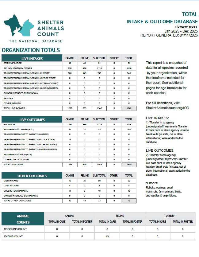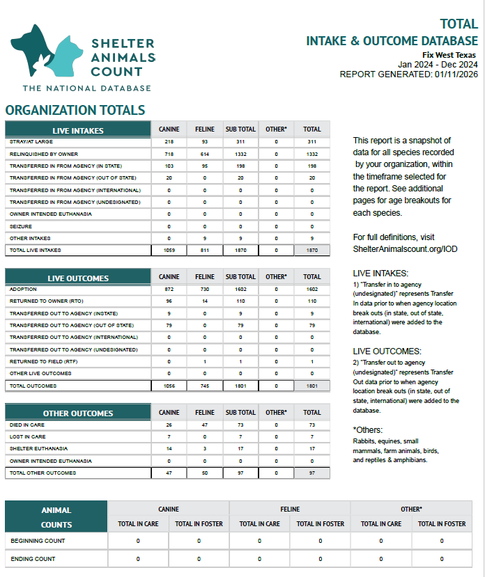 Click below to access reports from Shelter Animals Count national database, which maintains records of intakes, outcomes, and number of shelter animals served.